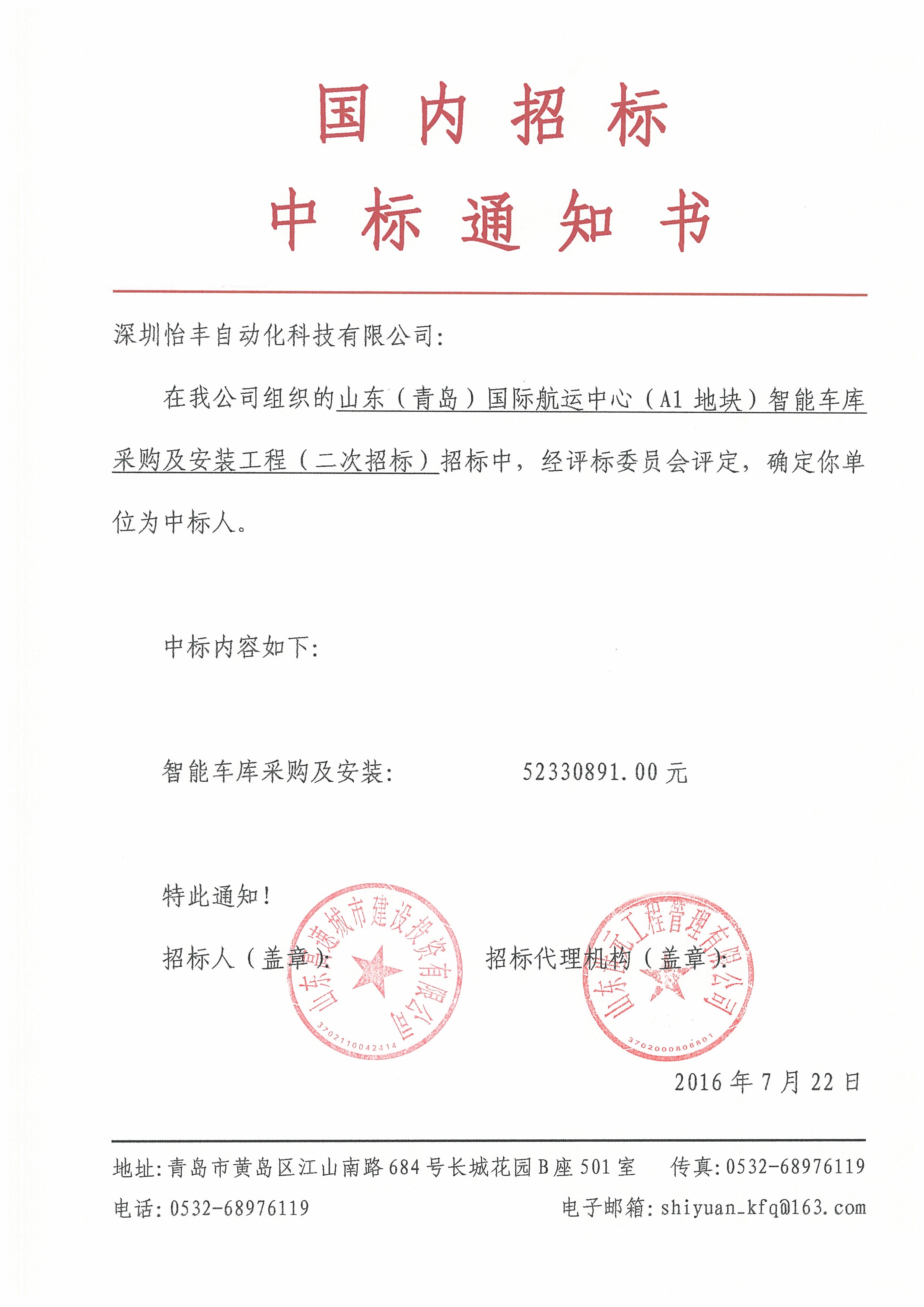 国际航运中心A1地块坐落于青岛市经济技术开发区中央商务区内,包括三座高层楼宇、一座裙楼和一座会展中心,项目总占地面积24472.69平方米,总建筑面积为237137平方米,其中地上159022.08平方米,地下78114.92平方米。该地块采用效率较高的全自动仓储式平面移动类停车设备,配备34套搬运系统和29套出入口系统,共计1495个机械停车位,平均每套系统负责43个车位,存取车速度可以保证平均90秒一辆车。而这些智能停车设备是被深圳怡丰自动化科技有限公司中标,中标价超5千万。