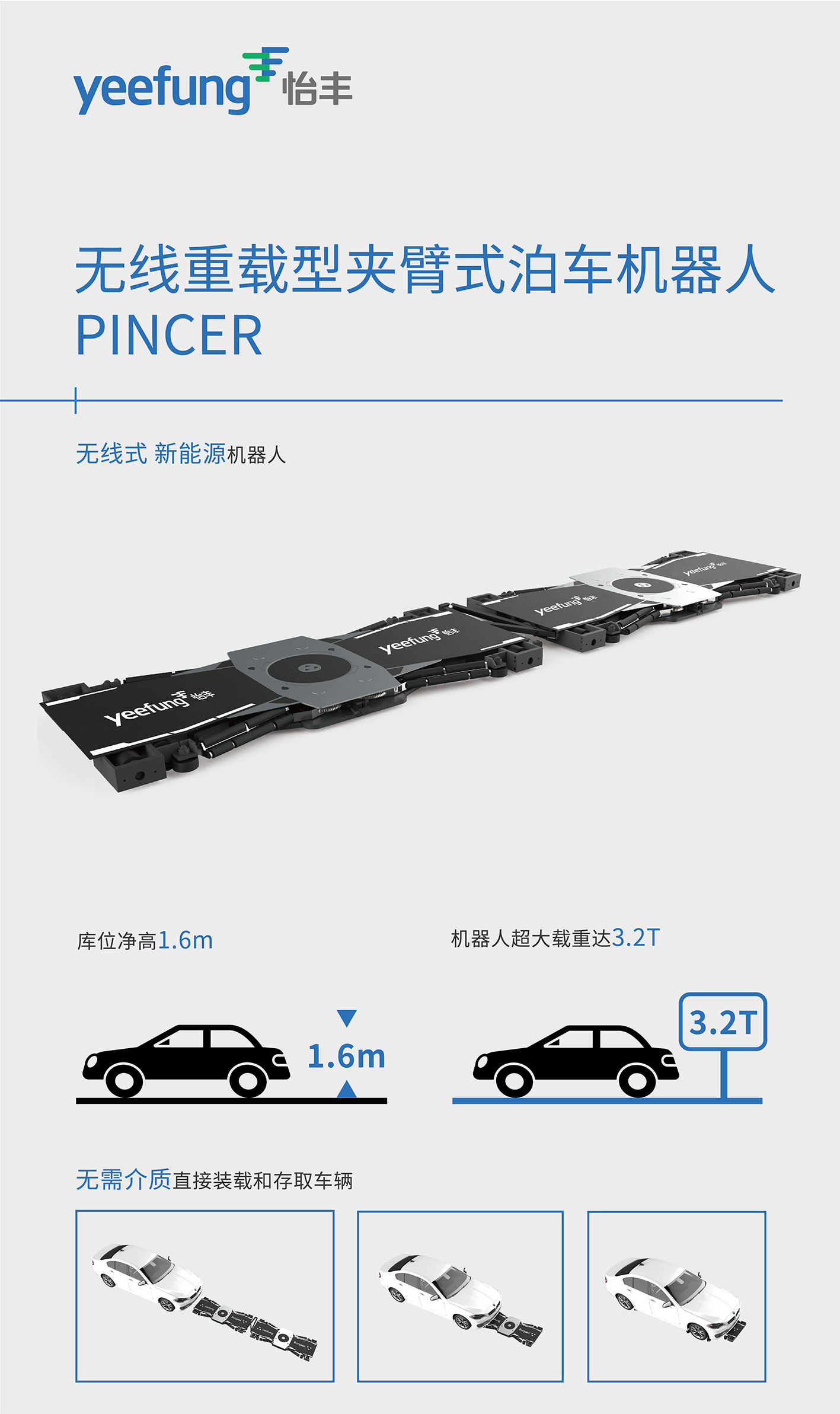 在智能立体车库中占据重要位置的怡丰无线重载型夹臂式泊车机器人PINCER,配备新能源动力,无需插电即可行走;超薄身型,机身净高仅为107毫米;普通轿车库位仅需1.6米库位净高,大大节省垂直空间;拥有超大载重,载重量可达3.2吨;自动适应车辆轴距,轴距范围2320~3560mm。