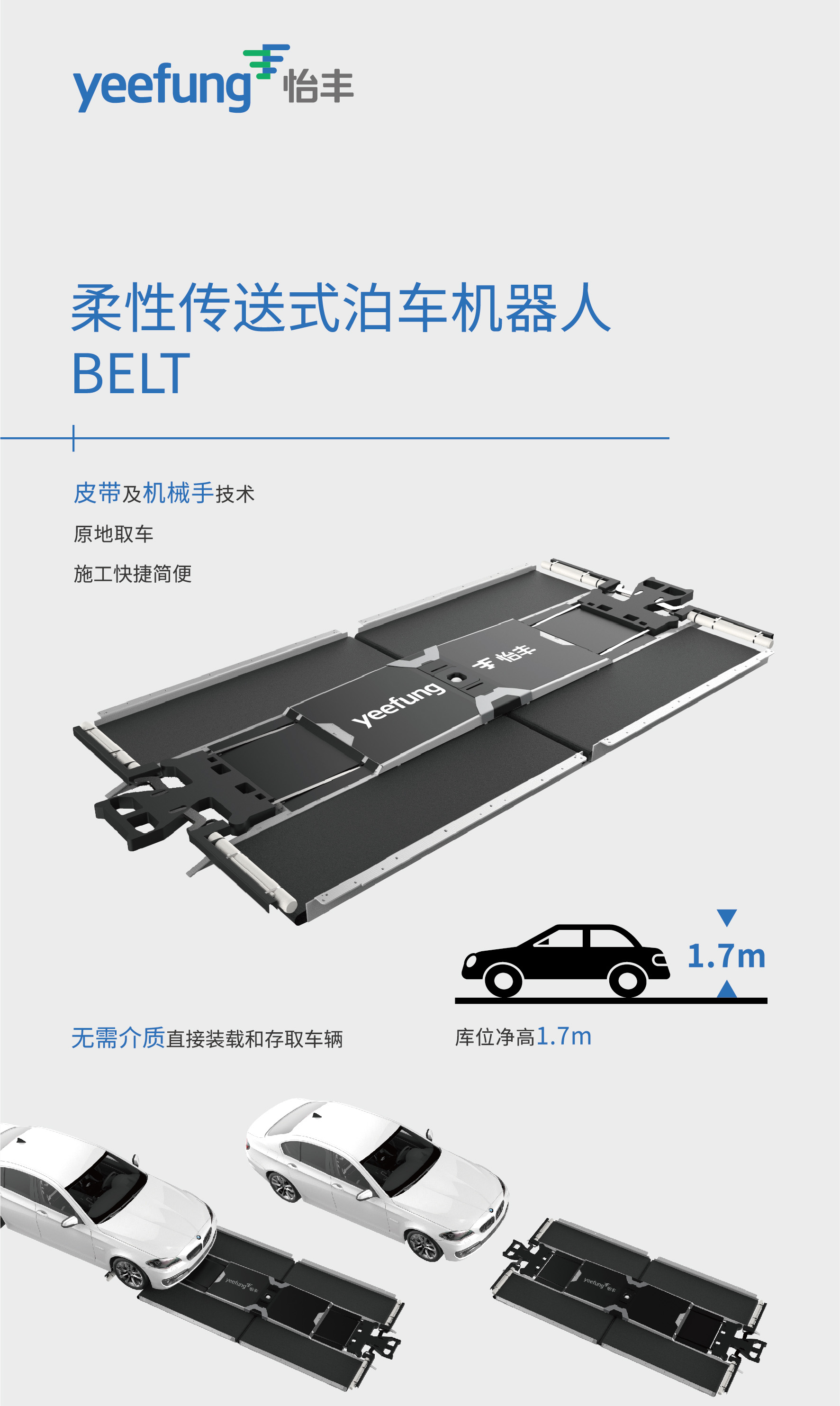 怡丰柔性传送式泊车机器人BELT,采用皮带及夹臂技术,不需要借助任何介质,即可直接从光整地面精准的装载和存放车辆;拥有轻薄机身,机身总高210毫米;普通轿车库位仅需1.7米库位净高,较大节省垂直空间;拥有较大载重性能,载重量达2.5吨;可自动适应车辆轴距,轴距范围3600mm以内。