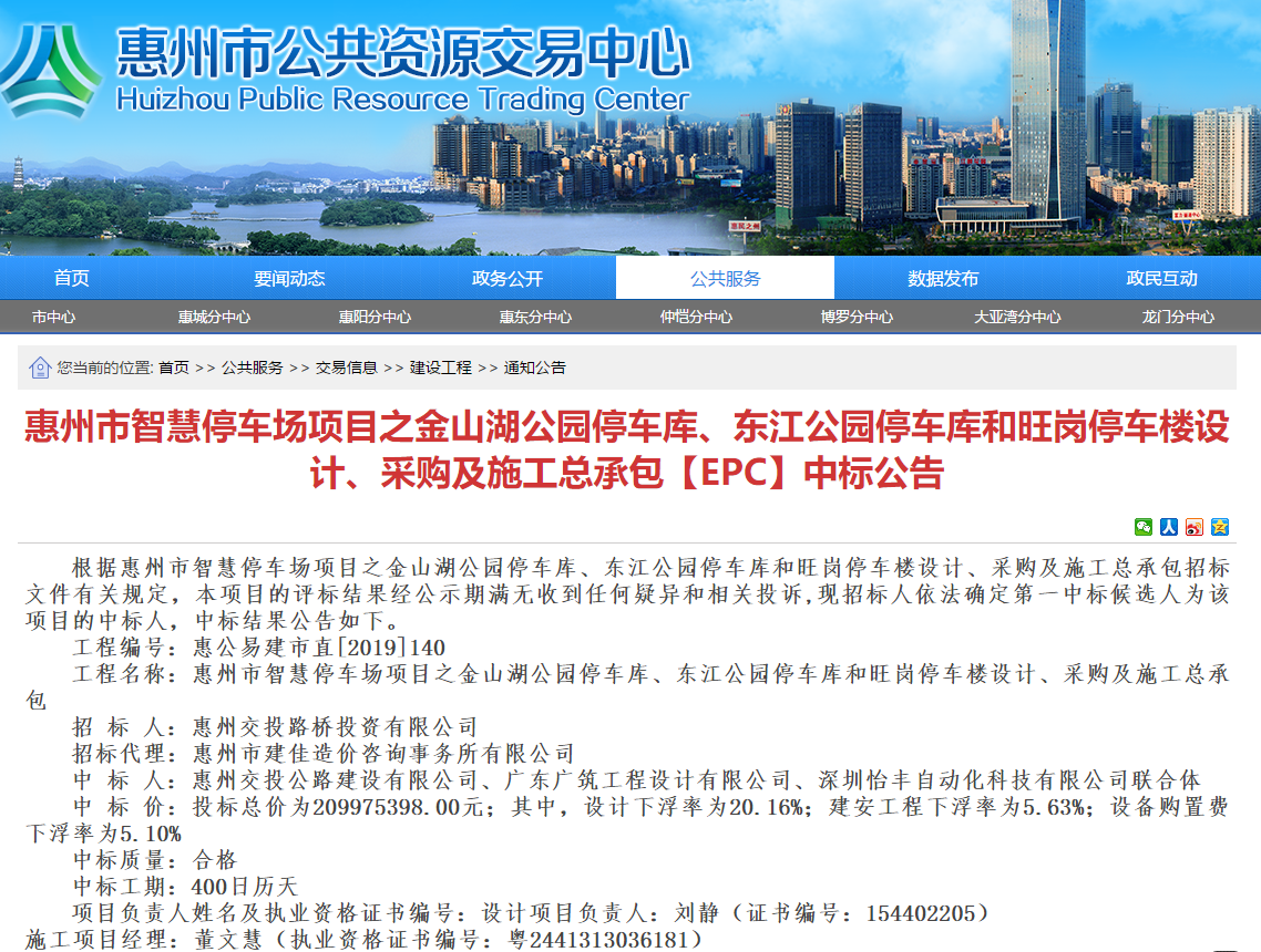 近日,在惠州交投路桥投资有限公司组织的惠州市智慧停车场项目之金山湖公园停车库、东江公园停车库和旺岗停车楼设计、采购及施工总承包招标活动中,怡丰成功中标,该标的总额为209975398.00元。